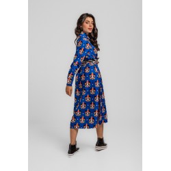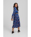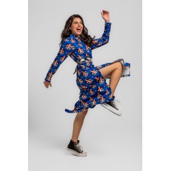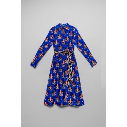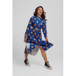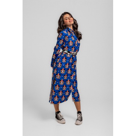 Vestido Camisero Largo Sencillo Lolina Punk Panda. Vestido camisero de tela fluida ligera con abse en azuk eléctrico y con estampado vectorial de cabezas de panda realizadas con figuras geoétricas en diversos colores llamativos. Cuello camisero y cierre frontal con botones. Manga larga con puño camisero. Cinturón de lazada en estampado combinado de geométricos para resaltar. Largo midi con bolsillos invisibles y aberturas laterales.