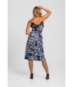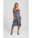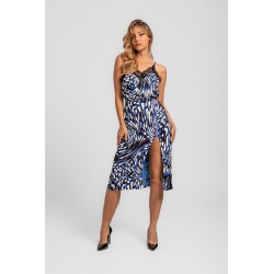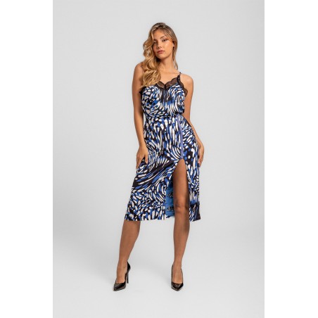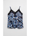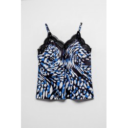 Blusa Lencera LOLINA Insurrección. Camiseta de tirantes, tipo lencera, con estampado vestorial en tonos negro, blanco y azul. Con encaje negro en escote tanto en laparte trasera como delantera. Los tirantes son ajustables en altura y su tejido es fluído y elástico.