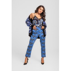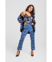 Pantalón Pitillo LOLINA I´M FELINA. Pantalón pitillo en animal print de leopardo en tonos rosa lila y naranja, de tejido fluído con cintura de talle alto y goma trasera. Abertura central con trabilla que cruza y cremallera. Dispone de bolsillos laterales.
