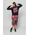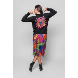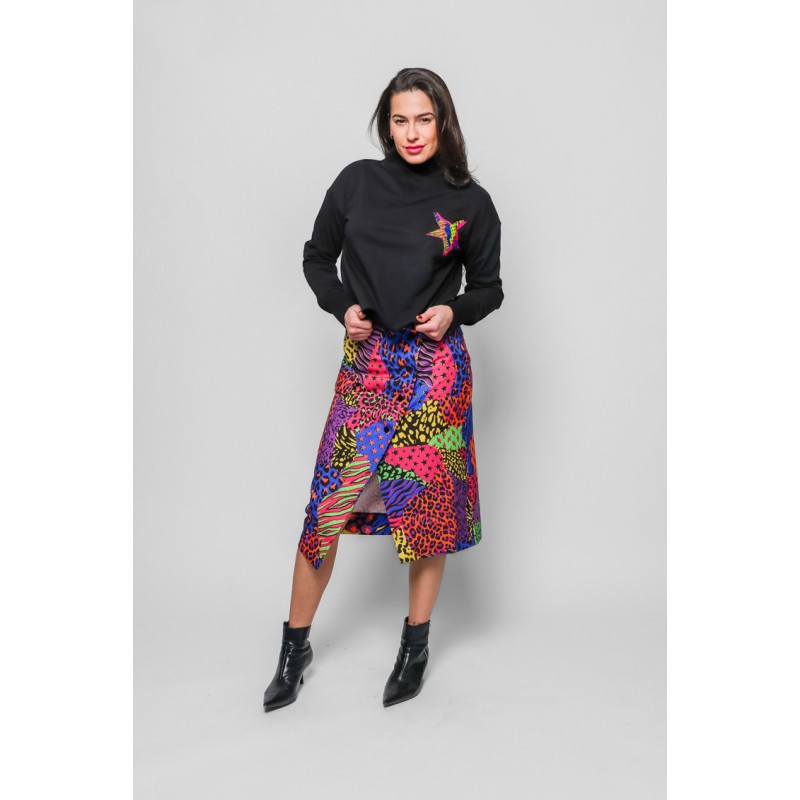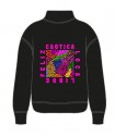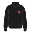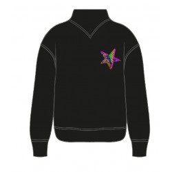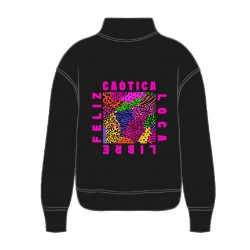 Sudadera Cuello Chimenea LOLINA CAÓTICA. Sudadera oversize con cuello chimenea y acabado en canalé en puños y bajo. En color negro con ilustración en pecho de una estrella a todo color y maxi ilustarción en espalda en diseño cuadrado con las palabras "caótica, loca, libre y feliz" en un llamativo rosa.