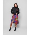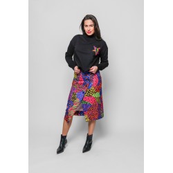 Falda Cowboy LOLINA ALMA LIBRE. Mini Falda de tejido fluído con corte de cuerpo estilo cowboy, con fondo negro y totalmente estampada de elementos en rojo y blanco.