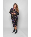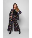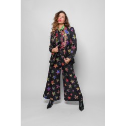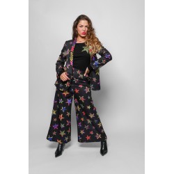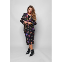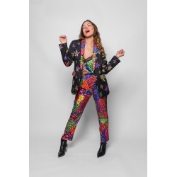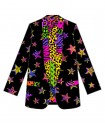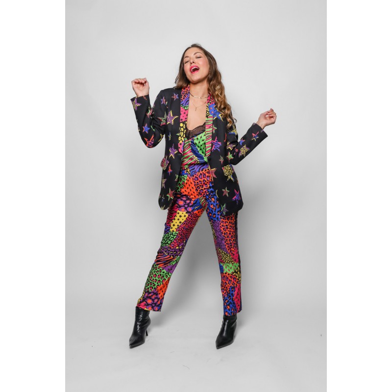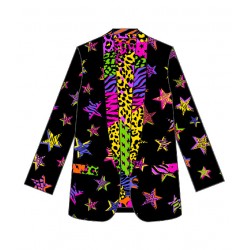 Americana Smoking LOLINA SHINY GIRL. Americana de corte recto y manga larga, con cuello smoking, realizada con estampado de estrellas en animal print sobre fondo negro y con solapas de cuello y bolsillos también en animal print llamativo. Con forro interior.