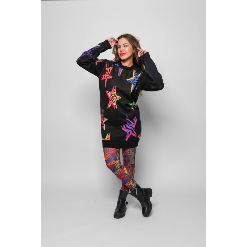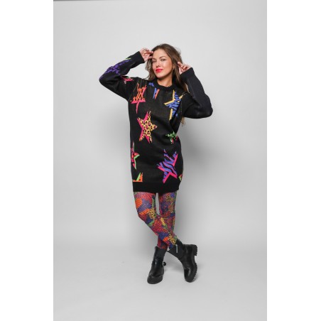 Vestido punto tejido Lolina SHINY GIRL. Vestido de punto grueso, como si fuera un jersey largo, de manga larga, totalmente estampado de estrellas animal print sobre fondo negro a contraste. De corte recto.