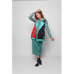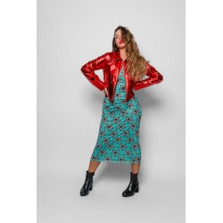 Vestido Tul Entallado Lolina ALMA LIBRE. Vestido de tul largo entallado y con manga larga. Totalmente estampado de elementos en rojo y blanco sobre fondo negro.