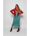 Falda Cowboy LOLINA ALMA LIBRE. Mini Falda de tejido fluído con corte de cuerpo estilo cowboy, con fondo negro y totalmente estampada de elementos en rojo y blanco.