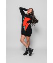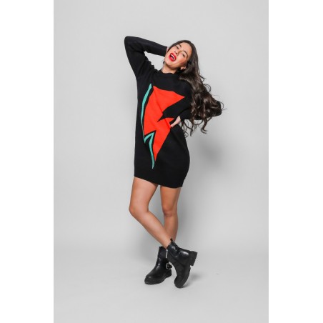 Vestido punto tejido Lolina LET´S DANCE. Vestido de punto grueso, como si fuera un jersey largo, de manga larga, en color negro y con un rayo "bowie" en el frontal a todo color. De corte recto.