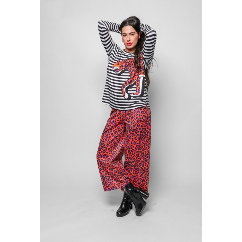 Camiseta Sencilla LOLINA I'M FELINA. Camiseta de algodon de manga larga, a rayas finas en blanco y negro como fondo. Print lateral de un tigre en tonos naranjas y fucsias.