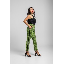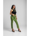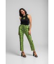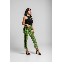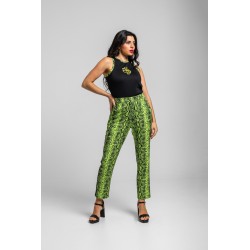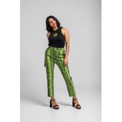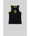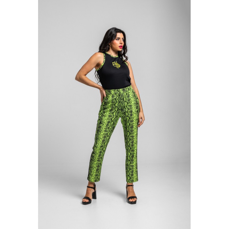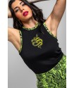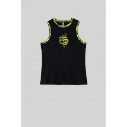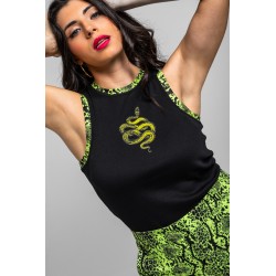 Camiseta Escote Nadador Lolina SNAKE. Camiseta en punto elástico negra sin mangas con espalda tipo nadadora con detalle de ribete fino en sisa y cuello en animal print de serpiente en flúor a conjunto con el estampado de serpiente frontal.