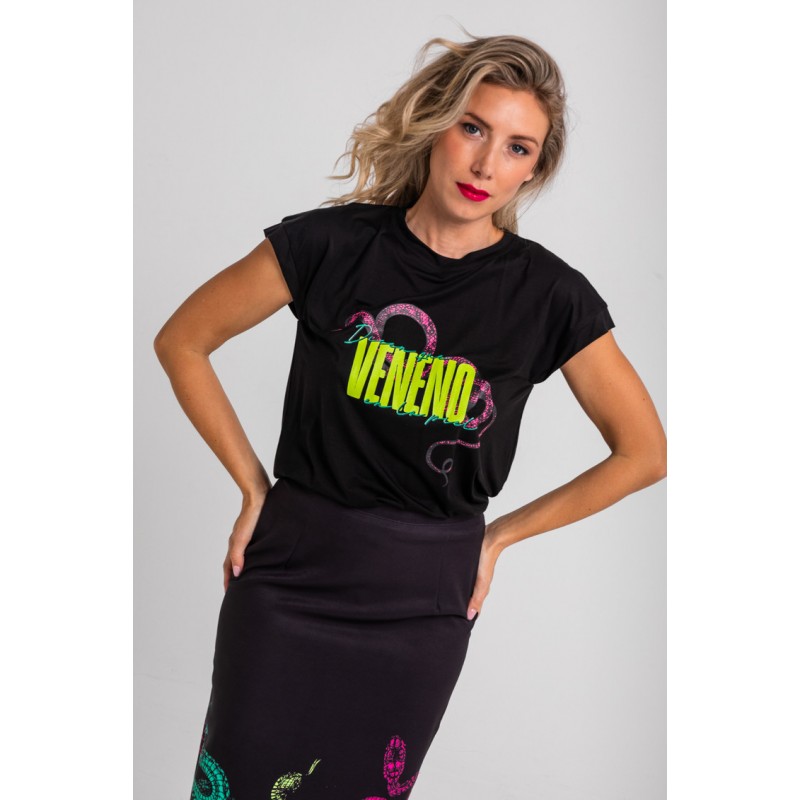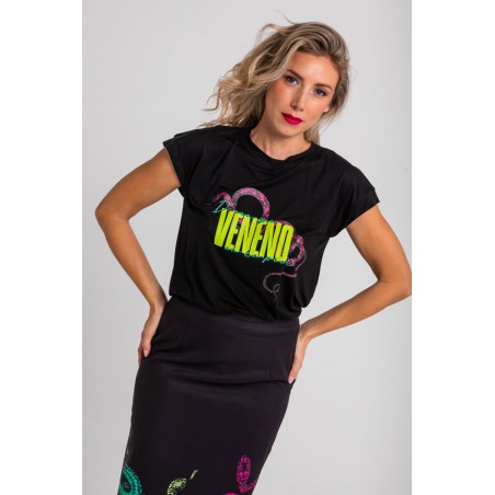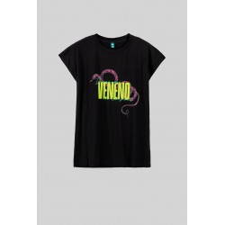 Camiseta sin mangas corte canalla Lolina SNAKE. Camiseta negra de corte recto y manga sisa, realizada en algodón elástico, con estampado frontal a contraste.