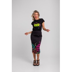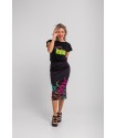 Minifalda Evasé Lolina SUMMER TIME. Minifalda con corte evasé en tejido fluído con base en color negro y estampada con motivos veraniegos. Cintura fija y cremallera lateral.