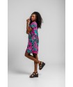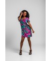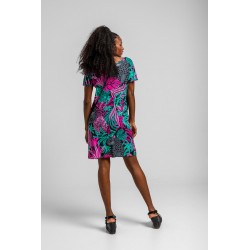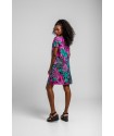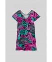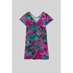 Vestido Corto Cuello Pico Lolina NOCTURNA. Vestido corto, de manga caída y cuello pico totalmente estampado de hojas en tonos flúor y leopardos en gris. Tela fluída y cómoda.
