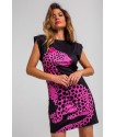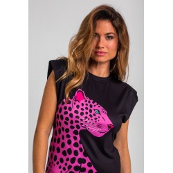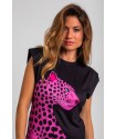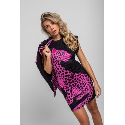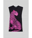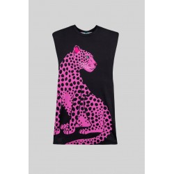 Vestido Corto Sin Mangas Elástico Lolina PINK PANTHER. Vestido ajustado corto de manga sisa, en color negro con ilustración delantera de leopardo rosa y trasera de rótulo en el bajo PINK PANTHER en animal print rosa. Dispone de lazada en animal print para atar en la parte trasera y ajustar el modelo. Con hombreras.