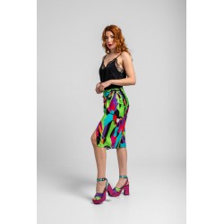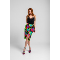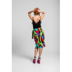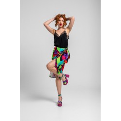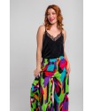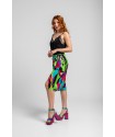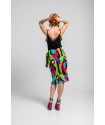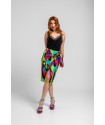 Minifalda Evasé Lolina SUMMER TIME. Minifalda con corte evasé en tejido fluído con base en color negro y estampada con motivos veraniegos. Cintura fija y cremallera lateral.