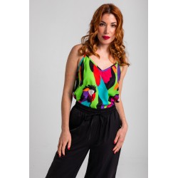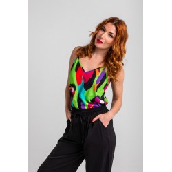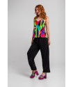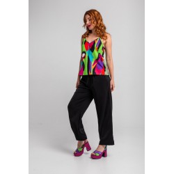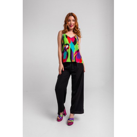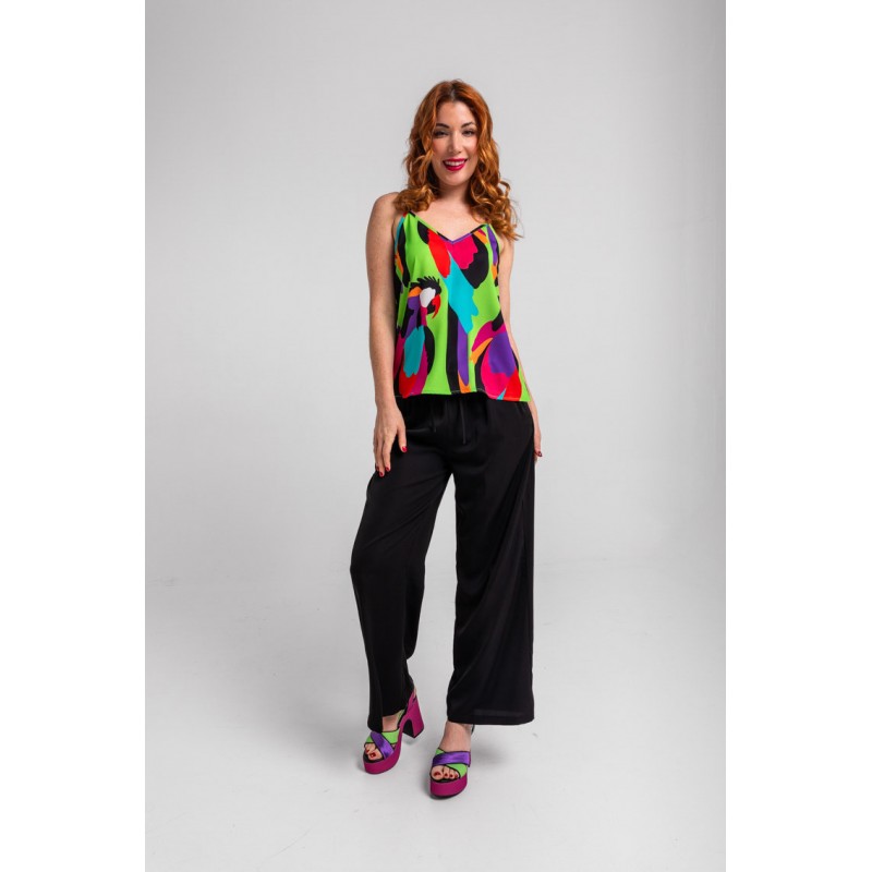 Camiseta Escote Nadador Lolina LET´S GO TO THE BEACH. Camiseta de tirantes con espalda tipo nadadora en punto elástico y de patrón entallado. En color negro con ilustración frontal de leopardo amarillo con gafas y pompa de chicle en rosa. Detalle de ribete fino en cuello y sisas en animal print amarillo.