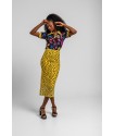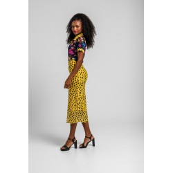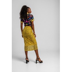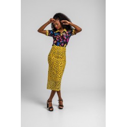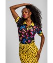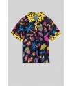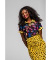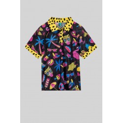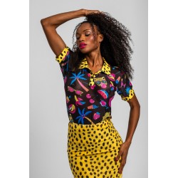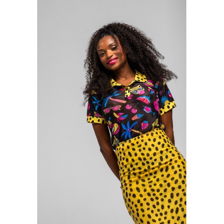 Camiseta Tipo Polo Lolina SUMMER TIME. Camiseta tipo polo de corte recto y manga corta en tejido elástico de tul totalmente estampado de motivos veraniegos en cuerpo, combinado con tejido de tela en cuello y mangas en amarillo animal print.