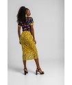 Minifalda Evasé Lolina SUMMER TIME. Minifalda con corte evasé en tejido fluído con base en color negro y estampada con motivos veraniegos. Cintura fija y cremallera lateral.