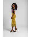 Mono Corto Lolina SUMMER TIME. Mono corto negro totalmente estampado de motivos veraniegos. En tejido fluído. Combina en cuello, zona de botones y bolsillo delantero y trasero tela en amimal print amarilla. Bolsillos funcionales. Cuerpo ancho y pernera ancha.