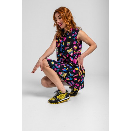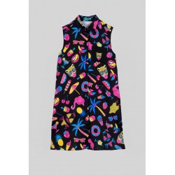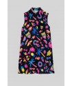 Camisero Corto Sin Mangas Corte A Lolina SUMMER TIME. Vestido camisero corto fluído, sin mangas, en cllor negro con estampado veraniego. De cierre de botones, bolsillo en pecho y bolsillos laterales funcionales.