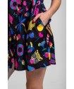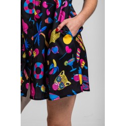 Minifalda Evasé Lolina SUMMER TIME. Minifalda con corte evasé en tejido fluído con base en color negro y estampada con motivos veraniegos. Cintura fija y cremallera lateral.