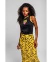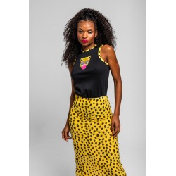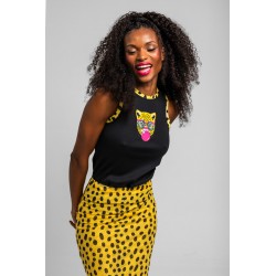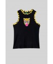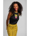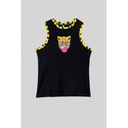 Camiseta Escote Nadador Lolina LET´S GO TO THE BEACH. Camiseta de tirantes con espalda tipo nadadora en punto elástico y de patrón entallado. En color negro con ilustración frontal de leopardo amarillo con gafas y pompa de chicle en rosa. Detalle de ribete fino en cuello y sisas en animal print amarillo.
