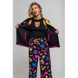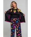 Mono Corto Lolina SUMMER TIME. Mono corto negro totalmente estampado de motivos veraniegos. En tejido fluído. Combina en cuello, zona de botones y bolsillo delantero y trasero tela en amimal print amarilla. Bolsillos funcionales. Cuerpo ancho y pernera ancha.