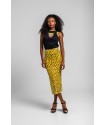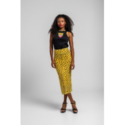 Minifalda Evasé Lolina SUMMER TIME. Minifalda con corte evasé en tejido fluído con base en color negro y estampada con motivos veraniegos. Cintura fija y cremallera lateral.