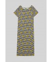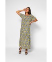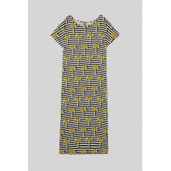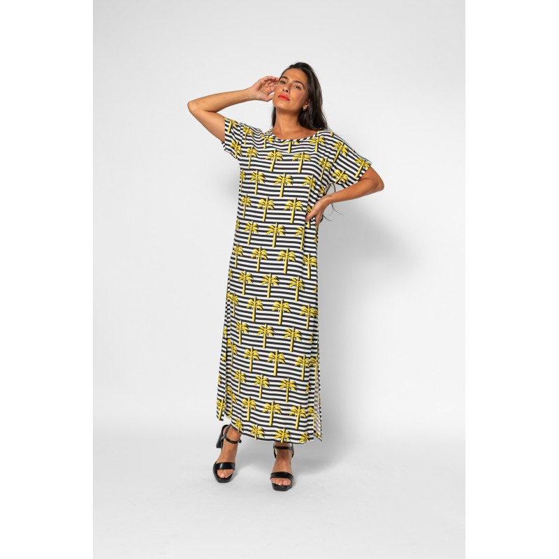 Vestido Camiseta Lolina LA FARAONA. Vestido tipo camiseta, largo, a rayas blancas y negras con estampado de palmeras amarillas. De manga corta sin sisa. Cortes en los laterales.