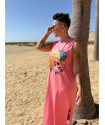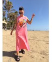 Vestido Mad de Mad Influence. Vestido over en color gris plomo de algodón combinado con rejilla en la parte de abajo en blanco hueso a constrate que queda espectacular. Lleva el frontal totalmente estampado de letreros con el nombre de la marca.