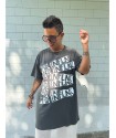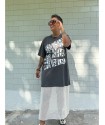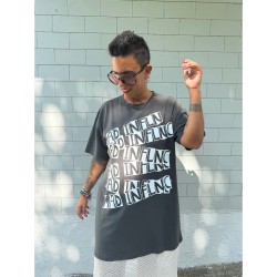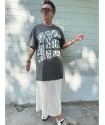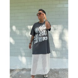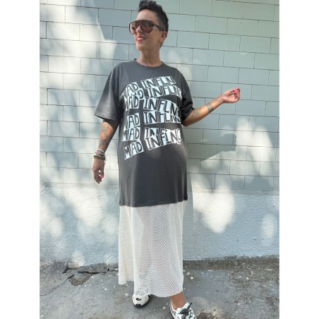 Vestido Mad de Mad Influence. Vestido over en color gris plomo de algodón combinado con rejilla en la parte de abajo en blanco hueso a constrate que queda espectacular. Lleva el frontal totalmente estampado de letreros con el nombre de la marca.