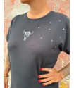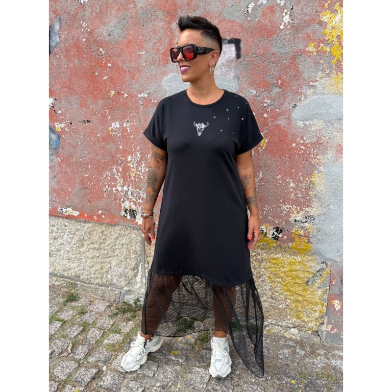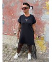 Vestido Rock Star de Mad Influence. Vestido largo de cuello redondo, en color negro y de manga larga. Con ilustración frontal de Rock Star. Dispone además de aberturas laterales.