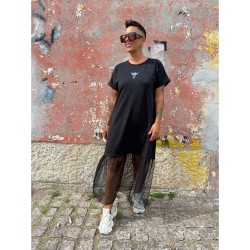 Vestido Logo de Mad Influence. Vestido largo de manga corta, con base en color negro en corte A con detalles de plumeti en la parte inferior del vestido, jugando con una doble textura en tejido, ya que el resto del vestido es de algodon.