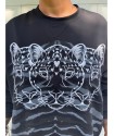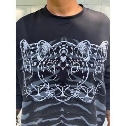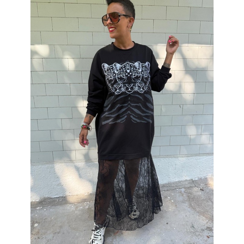 Vestido Jaguar de Mad Influence. Vestido largo de manga larga en tejido sudadera de corte oversize. En la parte frontal, sobre zona de animal print en negro y gris, tres jaguares bordados en color blanco.