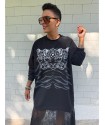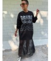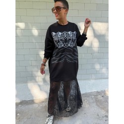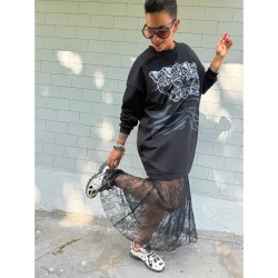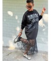 Vestido Mad de Mad Influence. Vestido over en color gris plomo de algodón combinado con rejilla en la parte de abajo en blanco hueso a constrate que queda espectacular. Lleva el frontal totalmente estampado de letreros con el nombre de la marca.