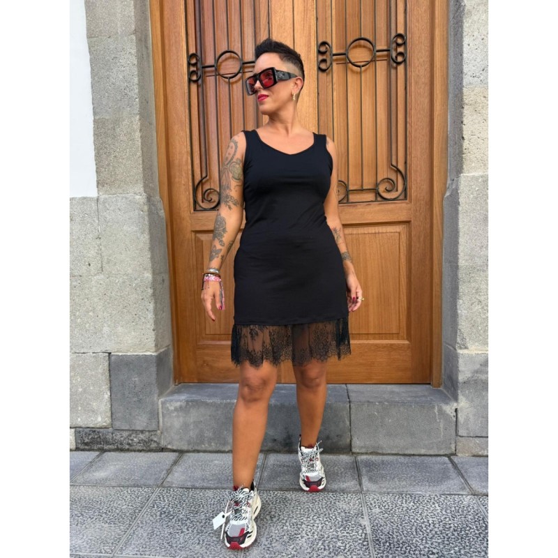 Vestido Lencero Corto Viscosa de Mad Influence. Vestido lencero corto en color negro con tirante ancho, tejido viscosa y bajo de encaje súper cañero y femenino. Un complemento esencial en tu fondo de armario que es ideal para combinar con cualquiera de las sudaderas largas de la marca y crear ese efecto vestido con bajo de encaje que no pasará desapercibido.