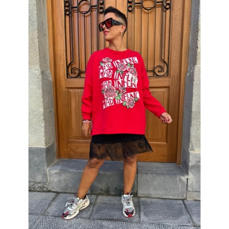 Sudadera Mad Rosas de la marca Mad Influence. Sudadera oversize en color rojo intenso con cuello redondo. Un patrón reconocido en la marca que es ligéramente más largo por detrás y que tan bien sienmta. Con un estampado frontal en el que combina el nombre de la marca con rosas y que le da un toque muy chulo.