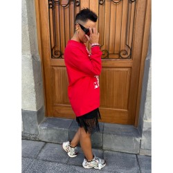 Una sudadera cómoda y versátil que junto con el vestido lencero corto negro, recién sacado por la marca, la convierten en un vestido de look muy cañero como se apercia en las fotos.