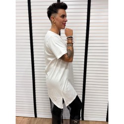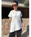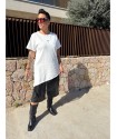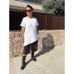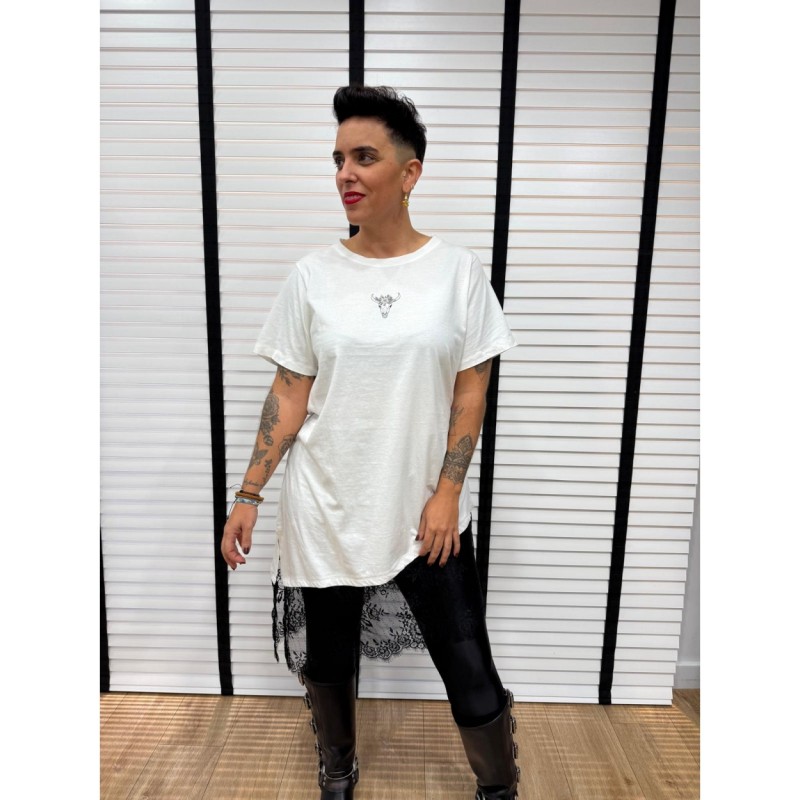 Camiseta Asimétrica LOGO de la marca Mad Influence. Camiseta blanca con corte asimétrico y con logo en negro en pecho. Dispone de puntilla negra en el bajo a contraste y además abertura en el lateral más largo.