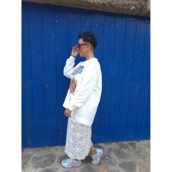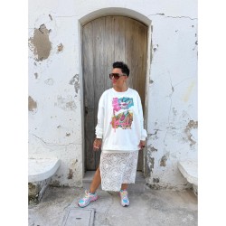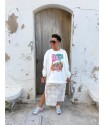 Tejido denim elastico, en un tono medio con print en la espalda de un encuadre con una jirafa con una flor en el pelo que le aportan color y un toque divertido. Incluye tambien una cinta con el logo de la marca, el mismo que llevan las faldas de algodon.