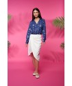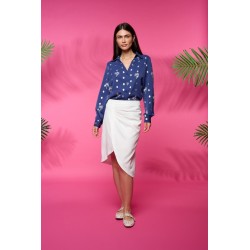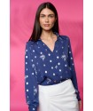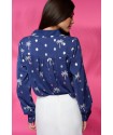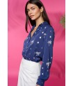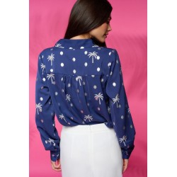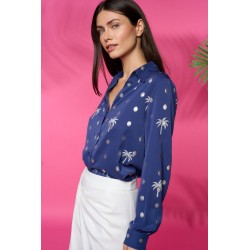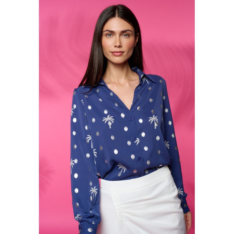 Palm Top Minueto. Camisa de manga larga, con base en color azulon y estampado de lunares y palmeras en foil plateado. Camisa con cuello pico y cerrada con botones hasta la parte de abajo.