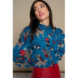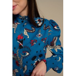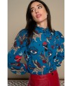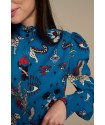 Cinnia Top de Minueto. Camisa con cuello imperial y manga larga, ligeramente abullonada y con fruncido en hombro, acabada en puño ancho. Diseñada con un estampado con motivos muy originales, como no podía ser de otro modo, en los que combinan el rojo, blanco y negro sobre un fondo azul. Una camisa diferente pero con personalidad que no dejará indiferente a nadie.