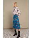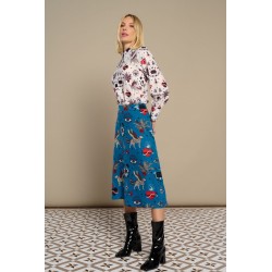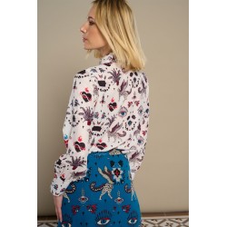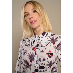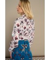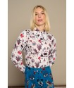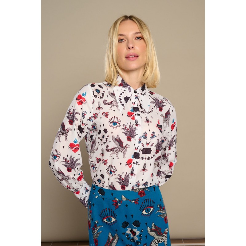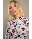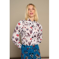 White Mytho Top de Minueto. Camisa de cuello puntiagudo y manga larga con fruncido ajustado al puño largo. Con un estampado de diseño original en tonos rojos y negros sobre fondo blanco que sienta fenomenal.