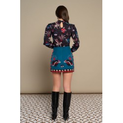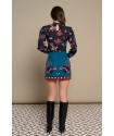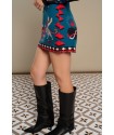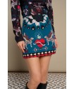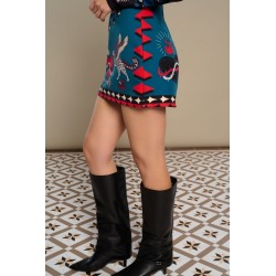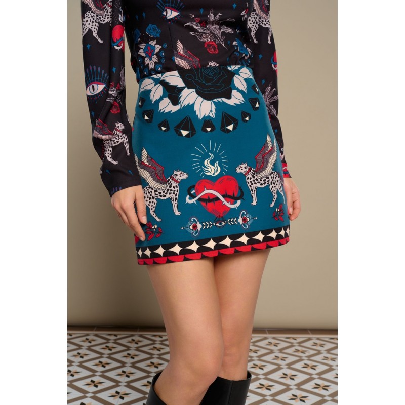 Mytho Skirt de Minueto. Falda tubo corta, con estampado original de diferentes motivos que combinan en blanco, negro y rojo sobre fondo azul. Cintura fija, con pinzas en la parte trasera y cierre de cremallera invisible central.