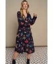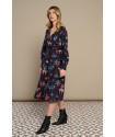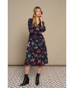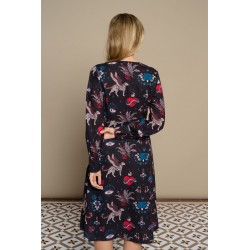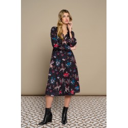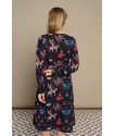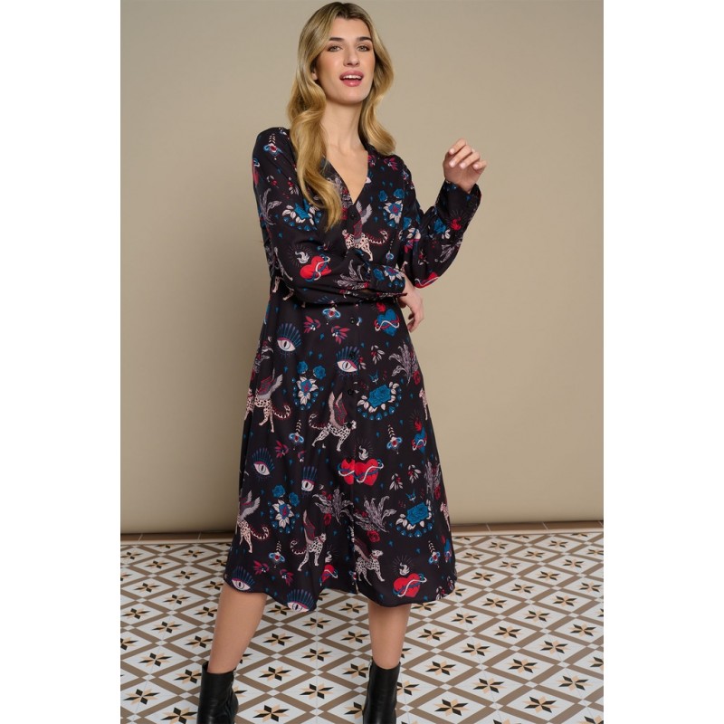 Dianora Dress Minueto. Vestido largo, por debajo de la rodilla, de estilo camisero pero con corte en la cintura, lo que le aporta un corte en A a la falda. Totalmente estampado con un diseño muy cañero en el que combina los colores rojo, azul y blanco sobre el fondo negro. De cuello pico, lo que le hace extremadamente favorecedor y abotonadura en todo su frontal. Manga larga y puño ancho con doble botón.