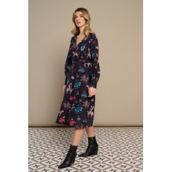 Minina Dress Minueto. Vestido largo, de manga larga y cuello redondo, totalmente estampado de leopardos en tonos salmón, verde, blanco y gris sobre fondo negro, en un diseño ajustado al cuerpo en la parte superior, pero con falda con más cuerpo y una caída ideal que le aporta mucho movimiento.