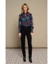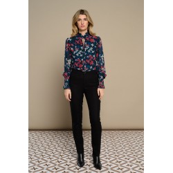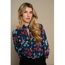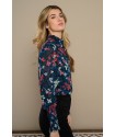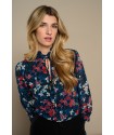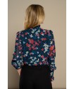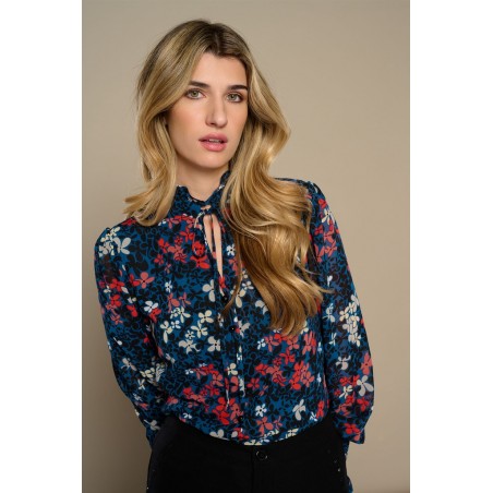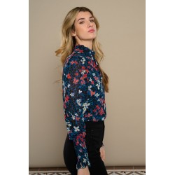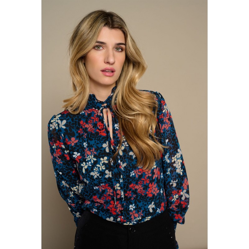 Rosella Top de Minueto. Camisa con cuello pico, pero con doble lazada en la parte superior por si se quiere llevar cerrado y presentar un escote lágrima. De manga larga abullonada acabada en nido de abeja ancho con volante, con lo que se puede poner a diferente altura y dar una imagen más informal. Totalmente estampada de flores sobre fondo azul.