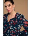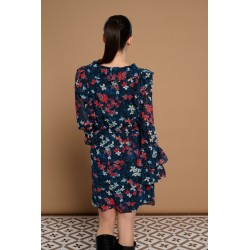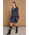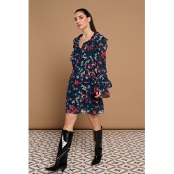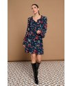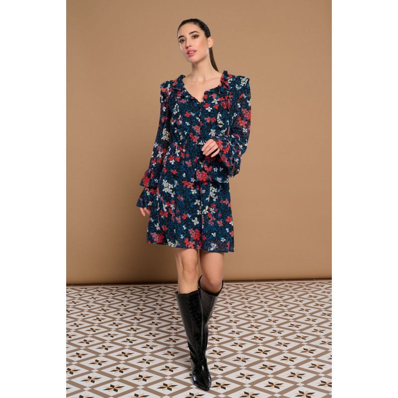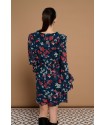 Paolina Dress Minueto. Vestido corto, de manga larga acabada en doble volante amplio. De cuello pico con volante y abotonado hasta la cintura, donde presenta un corte, marcado también por un volante que va desde el hombro, para luego completar el diseño con una falda con volante superior. Totalmente estampado de flores sobre fondo negro.