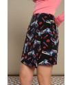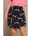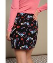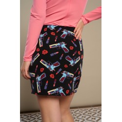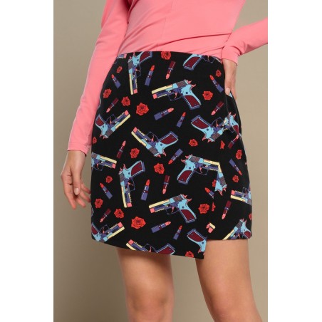 Vita Skirt Minueto. Falda tubo, hasta la zona de la rodilla, con estampado de pistolas, rosas y pintalabios sobre fondo negro, con diseño de tela cruzada en el frontal que le da un toque muy original. Con cremallera invisible en el lateral y cintura fija.