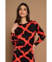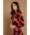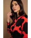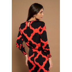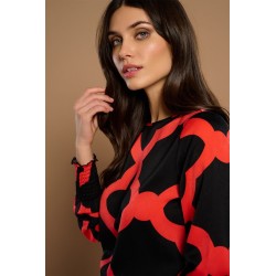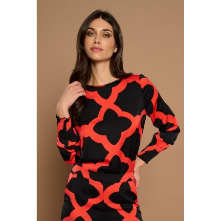 Gianna Top Minueto. Blusa de manga larga y cuello redondo con un estampado muy elegante en rojo y negro. Abotonadura en la parte trasera del cuello efecto lágrima y puños de las mangas terminados en nido de abeja ancho.