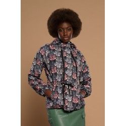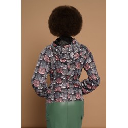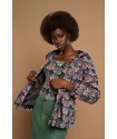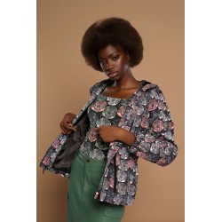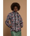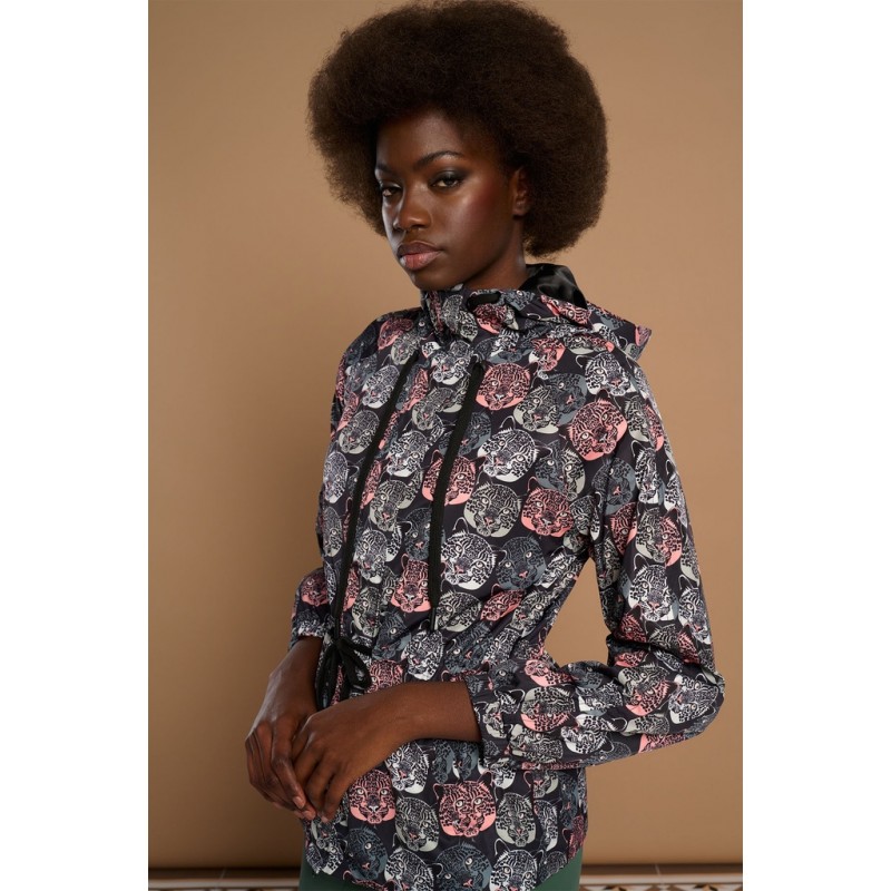 Gatto Raincoat de Minueto. Chaqueta de lluvia corta y de cuello alto, totalmente estampada de leopardos en tonos salmón, gris y blanco sobre fondo negro, lo que la hace una prenda facilmente combinable y discreta dentro de la originalidad que la marca da a sus prendas con sus estampados cañeros. Dispone de cordones en la zona del cuello y en la cintura para ajustar a la figura si se desea así como gorro y bolsillos laterales. Una prenda cómoda que no puede faltar en tu fondo de armario esta temporada.