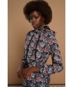 Minina Dress Minueto. Vestido largo, de manga larga y cuello redondo, totalmente estampado de leopardos en tonos salmón, verde, blanco y gris sobre fondo negro, en un diseño ajustado al cuerpo en la parte superior, pero con falda con más cuerpo y una caída ideal que le aporta mucho movimiento.
